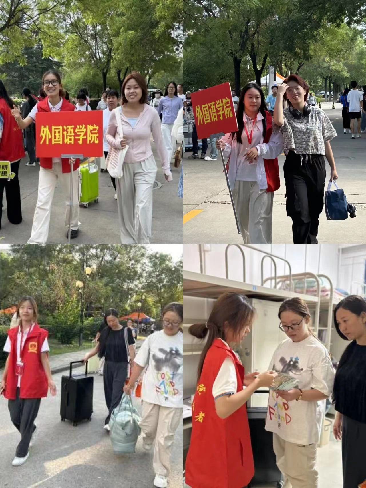 志愿者们在校园大巴停靠点悉心引导新生报到,在宿舍区域协助新生行李搬运,在此过程中结下了深厚友谊,同学们纷纷对志愿者们表达感谢,并感受到外院是一个温暖的大家庭。
